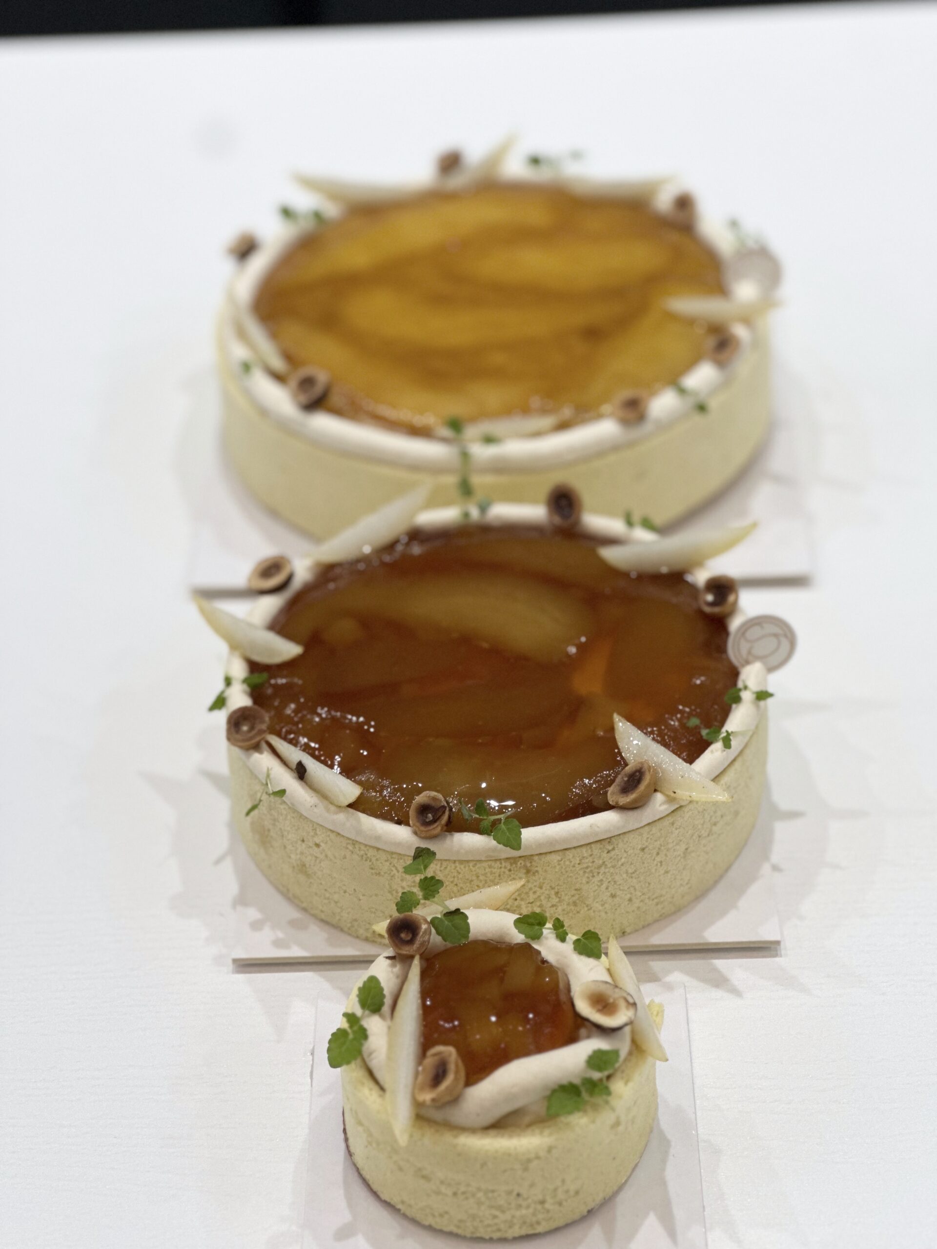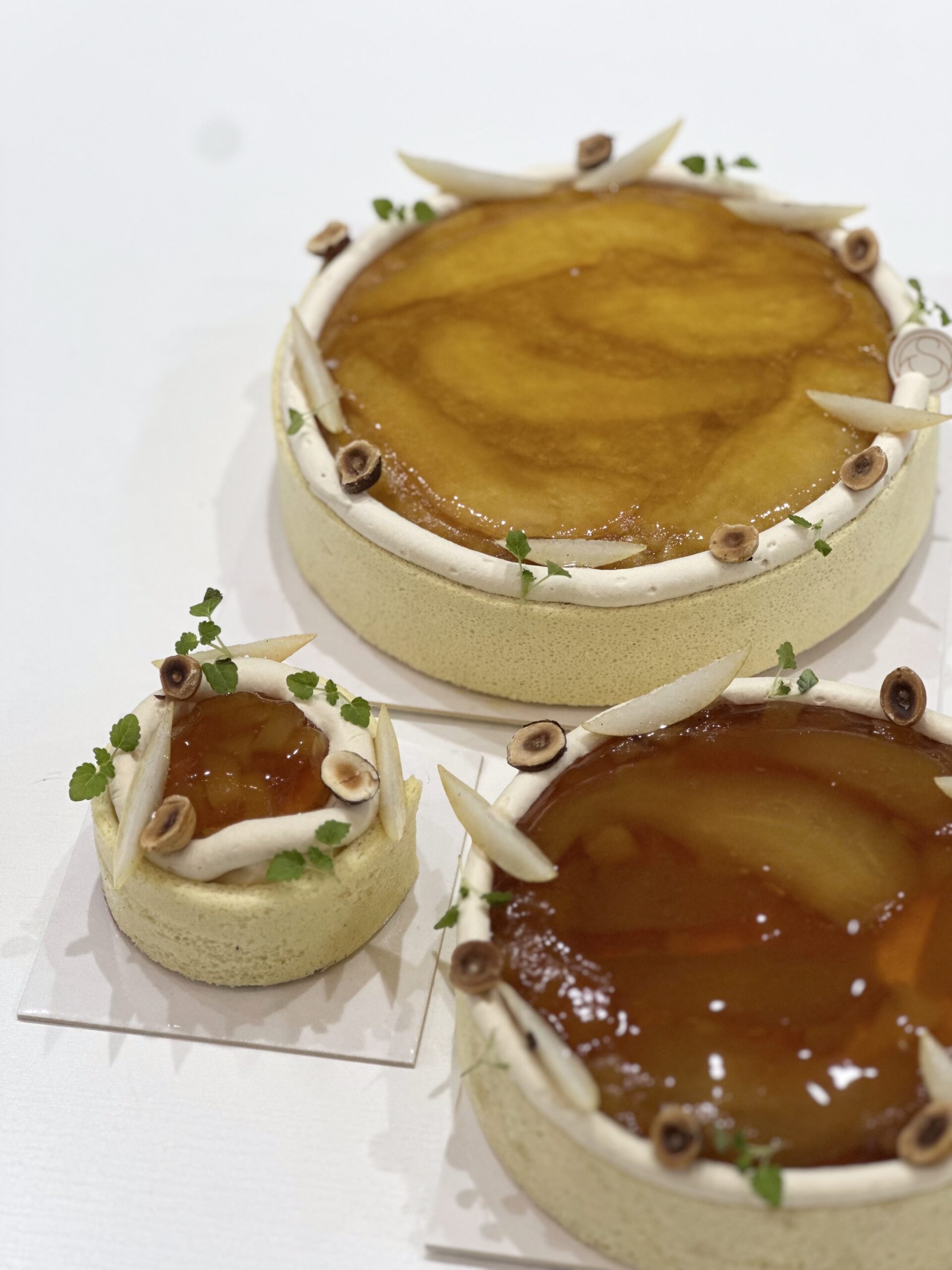 Composition : Biscuit amandier, croustillant façon palet breton, crémeux fève de tonka, caramel beurre salée, poire poché au caramel et biscuit pâte à choux.