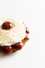Composition : pâte à choux glacée au caramel, sablé breton, crème pâtissière à la vanille, praliné croustillant amande/noisette, ganache montée vanille.