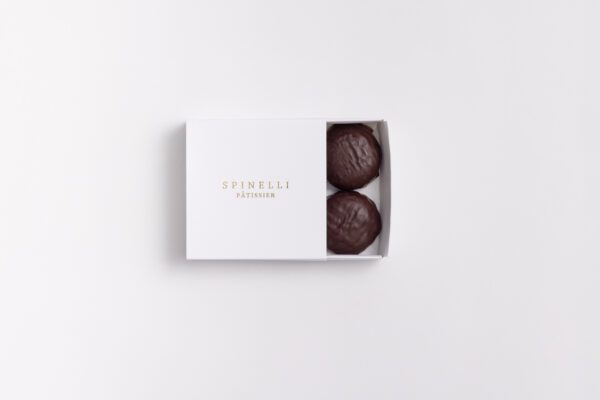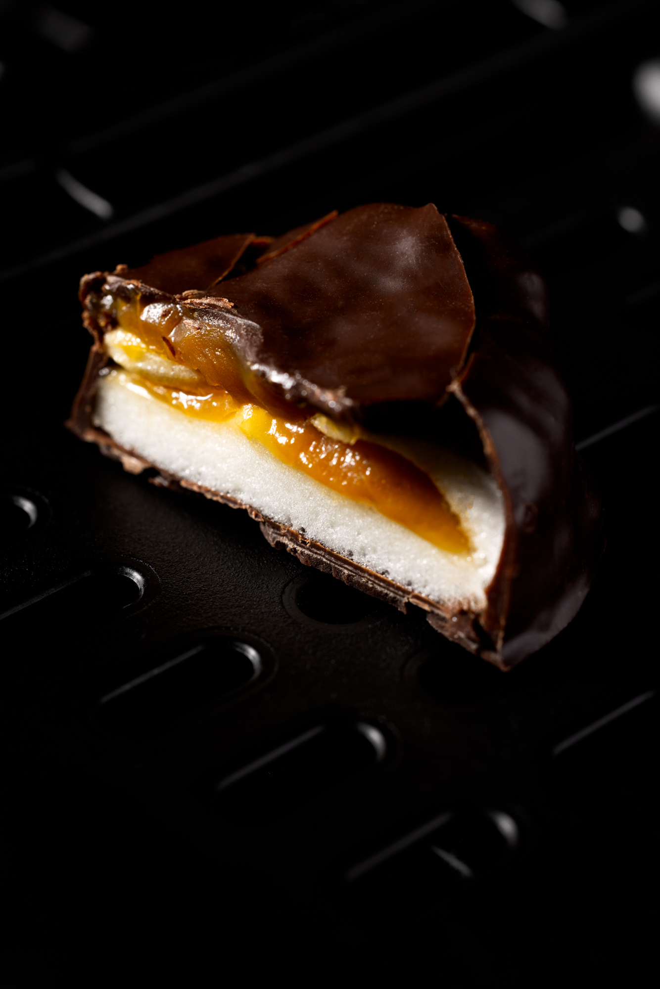 Guimauve à la vanille, fourré au caramel au beurre salée et enrobé de chocolat noir 70%.