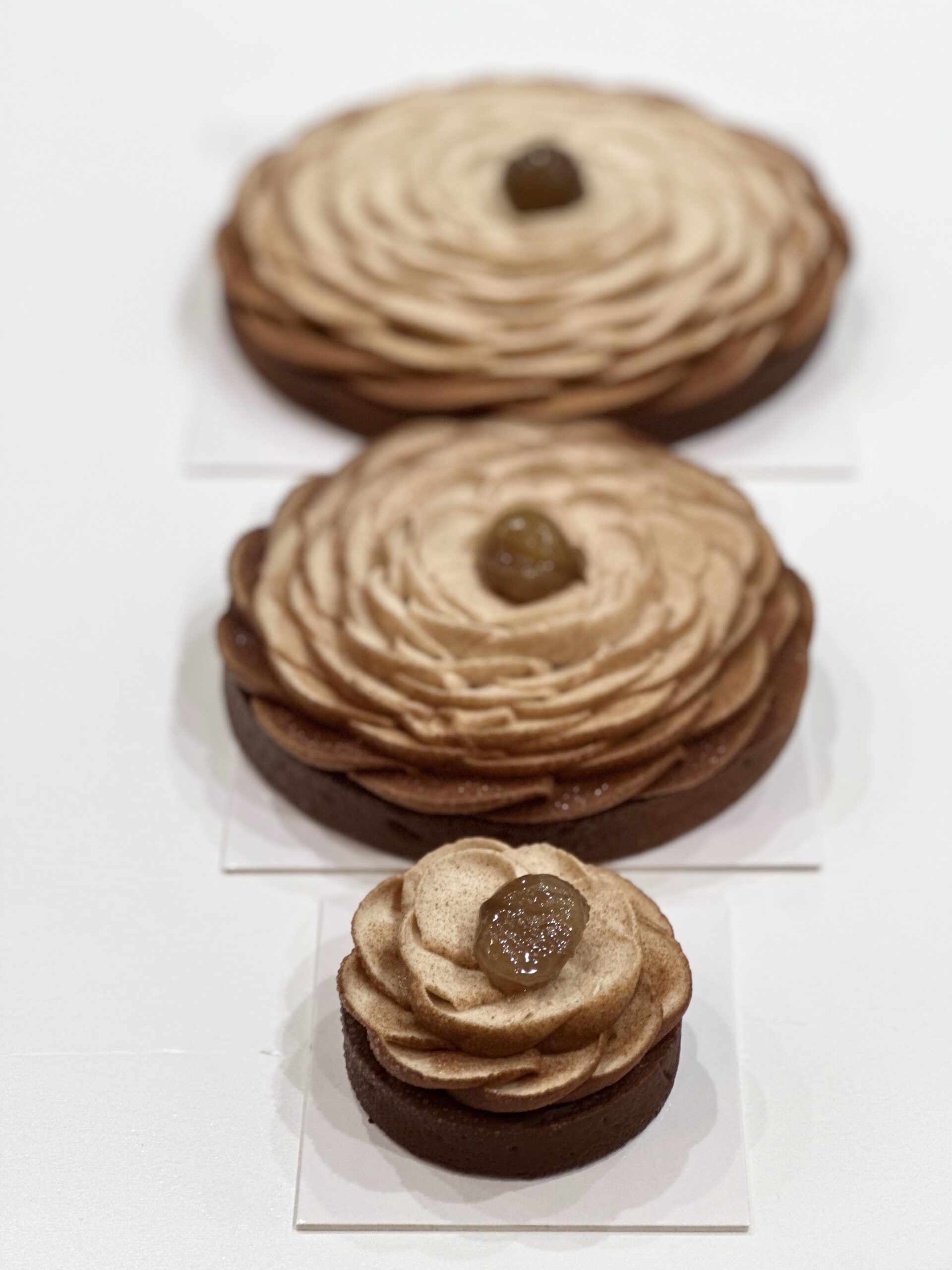 Composition : Pâte sucrée aux amandes, crème d’amande, crémeux marron, ganache montée marron, marron confit
