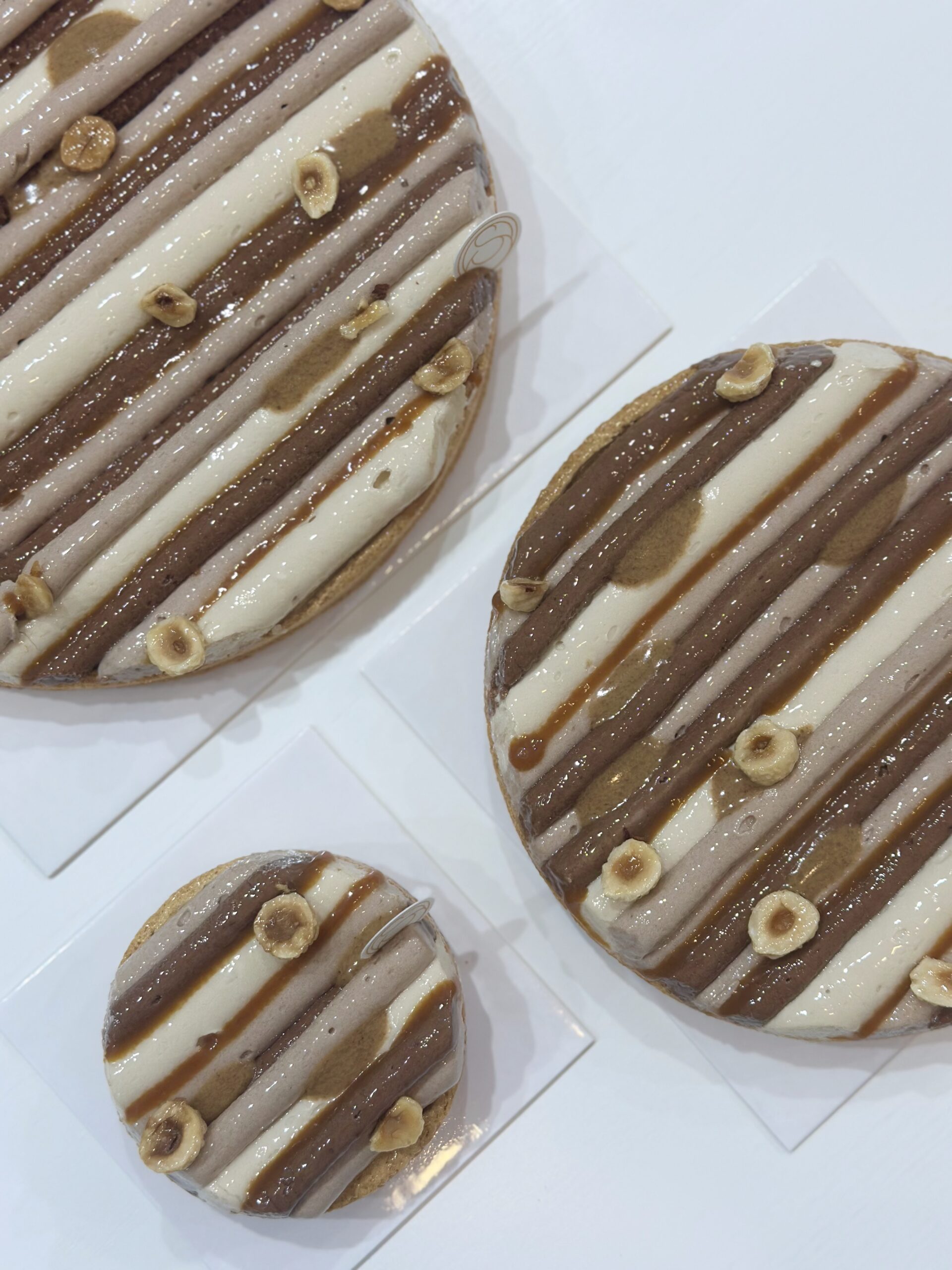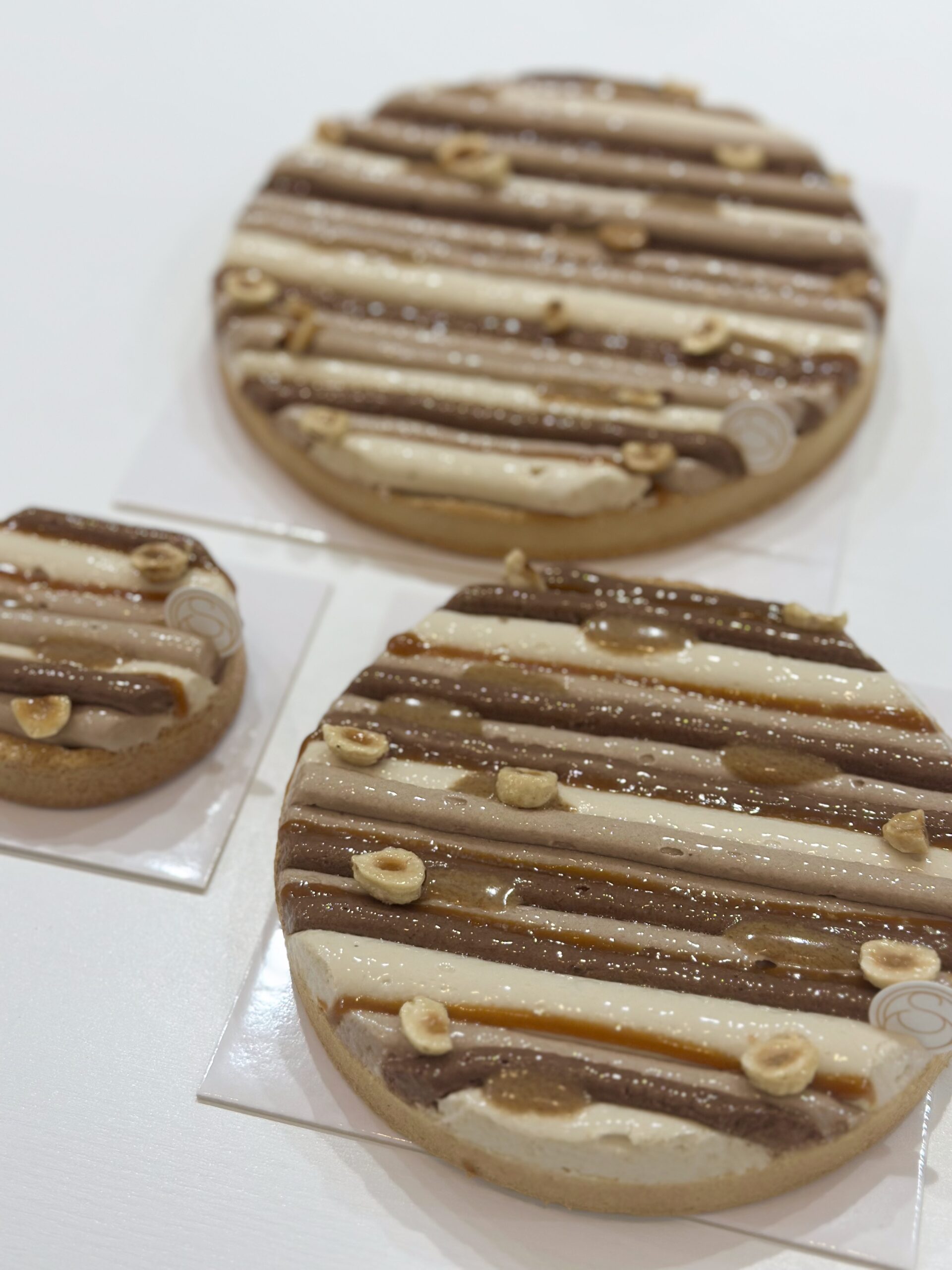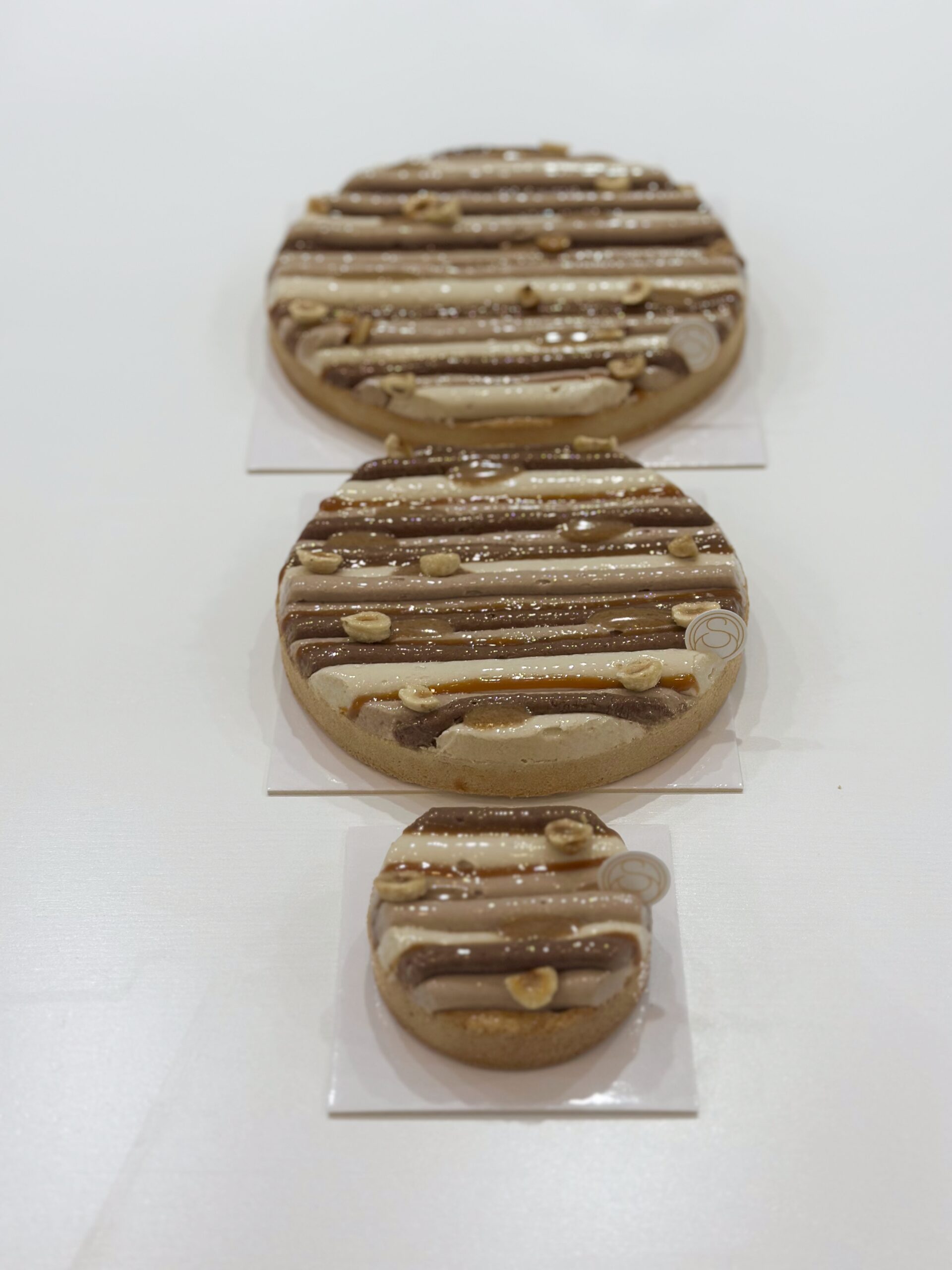 Composition : Pâte sucrée amande, crème d’amande, praliné noisette croustillant, ganache monté chocolat lai/dulce/chocolat noir.