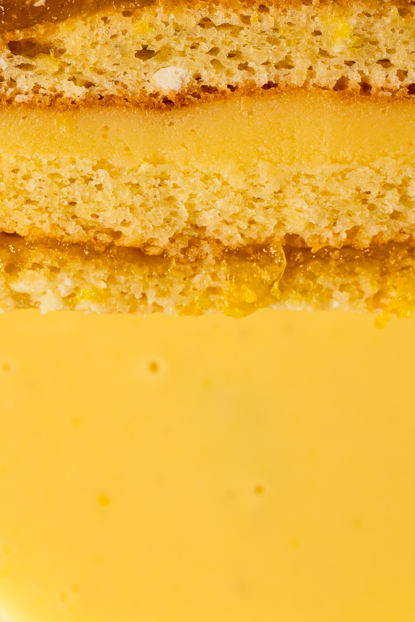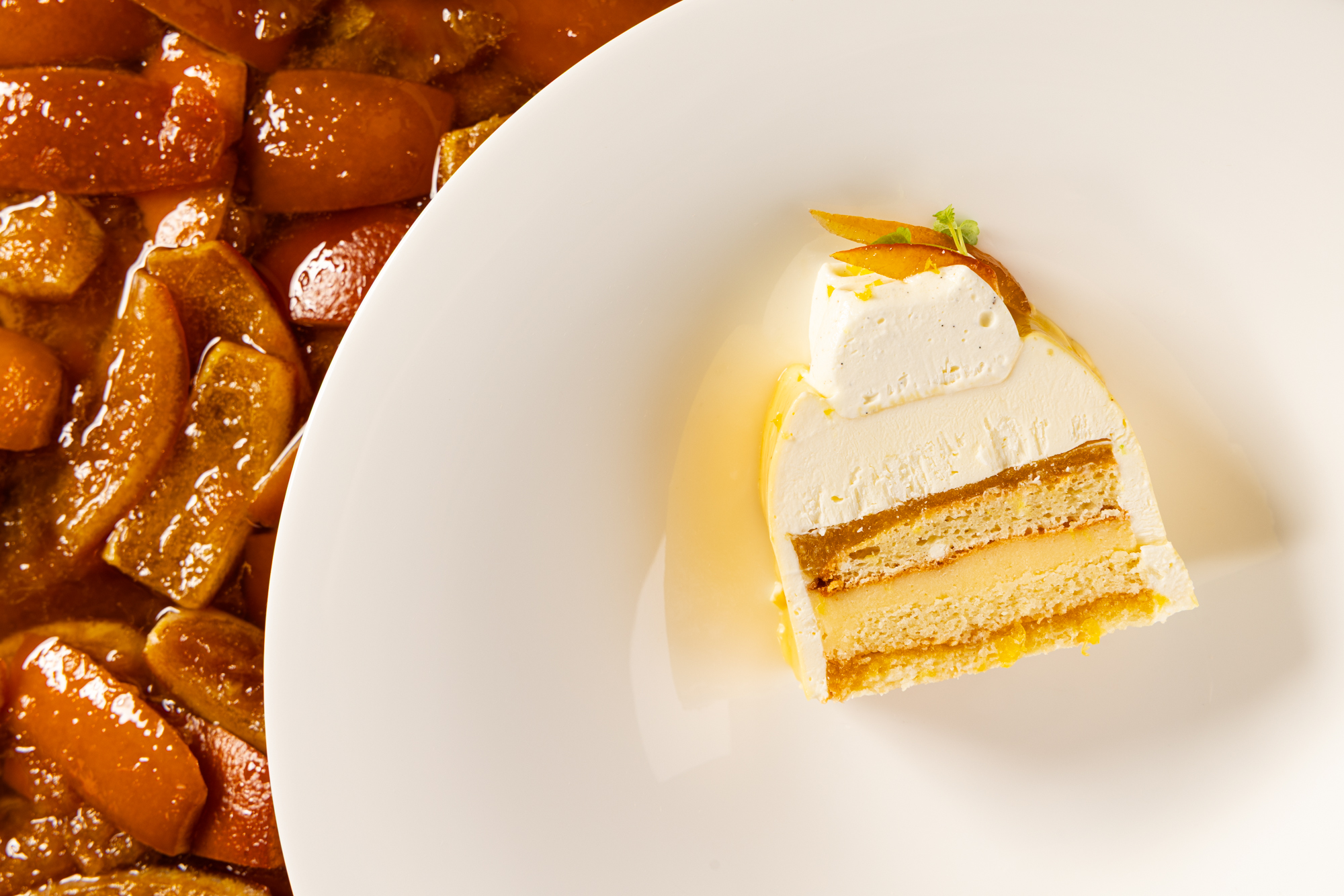 Biscuit Joconde aux amandes, crémeux citron, marmelade d’orange, crème légère citronnée, ganache montée à la vanille, écorces d’agrumes confites, accompagnées d’une crème anglaise citronnée.