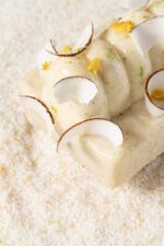 Biscuit amande sans gluten, croustillant praliné noix de coco, crémeux noix de coco, ganache montée passion, confit mangue, noix de coco fraiche et pour la sauce un gel au fruit exotique et citron vert.