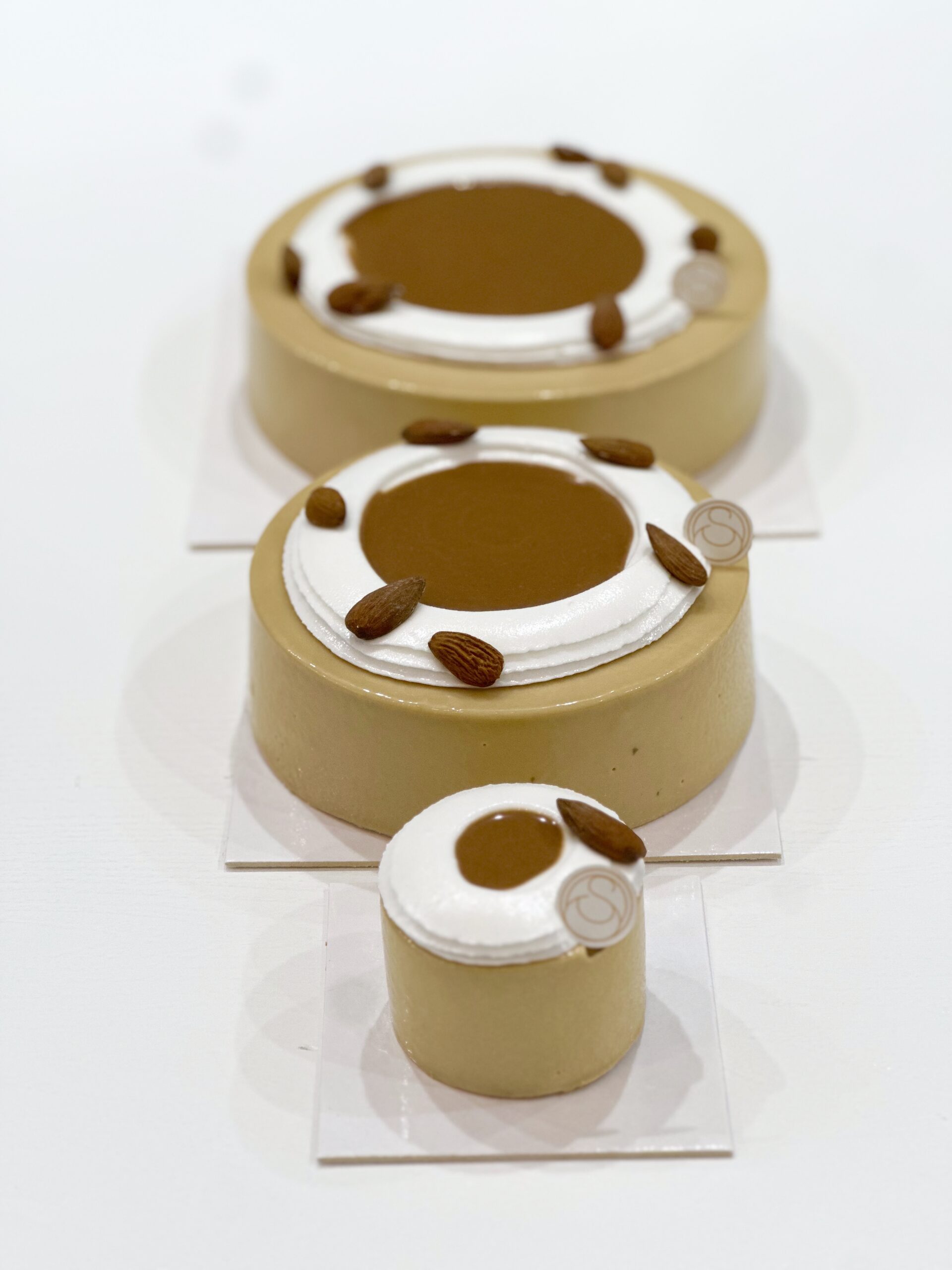 Composition : Biscuit amande sans gluten, pâte à tartiner amande, crémeux vanille, crémeux amande, mousse amande.