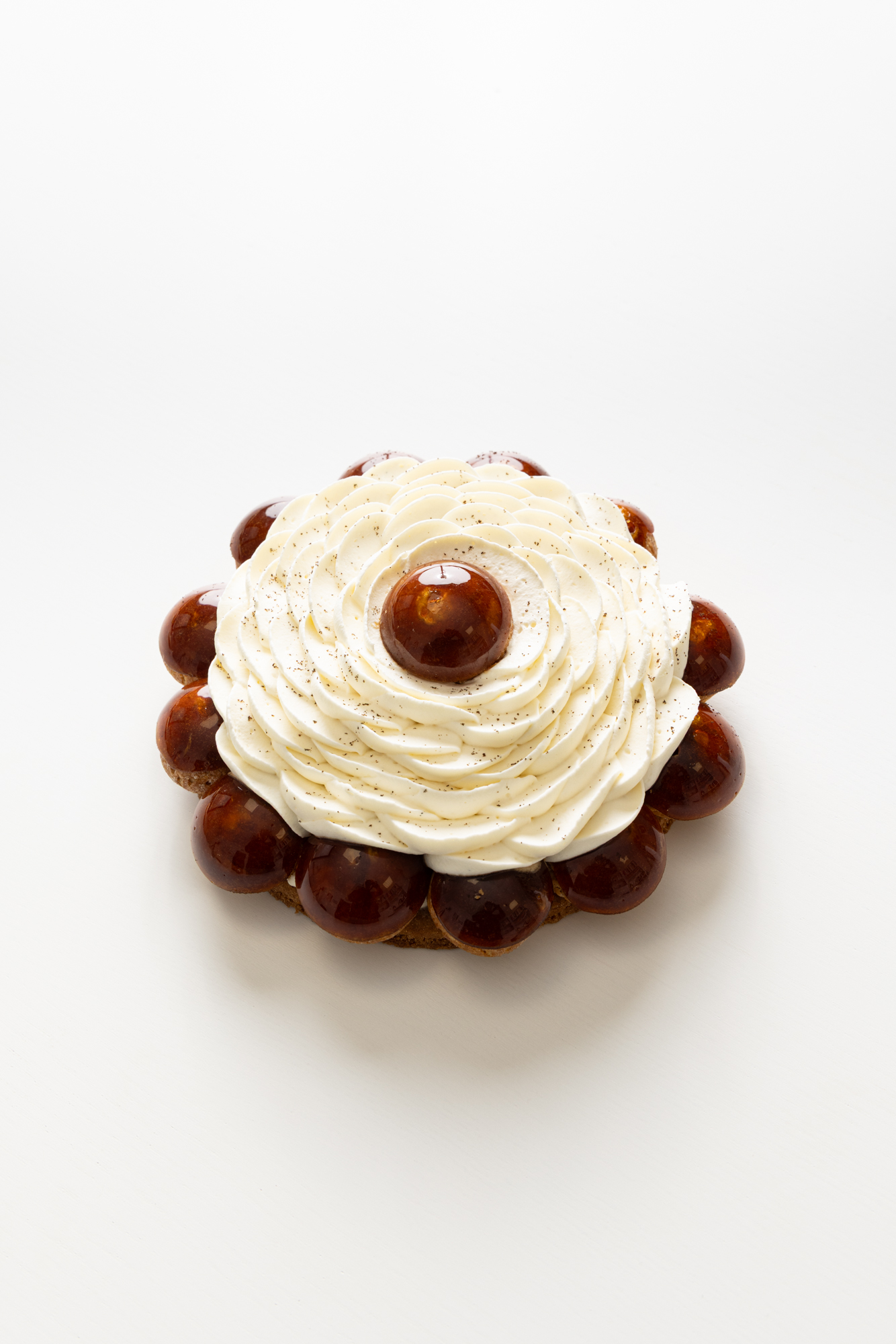 Composition : pâte à choux glacée au caramel, sablé breton, crème pâtissière à la vanille, praliné croustillant amande/noisette, ganache montée vanille.